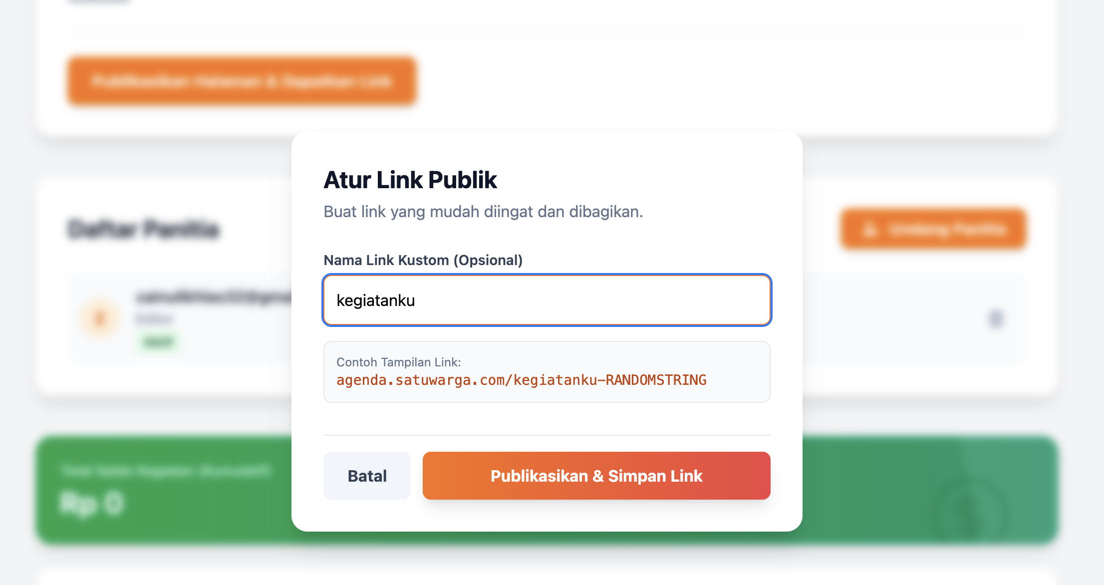 Satu fitur favorit saya di sini adalah kita bisa bikin Custom Slug. Jadi, link pendaftarannya nggak bakal berupa kode acak yang aneh, tapi bisa kita namain sesuka hati. Misal: agenda.satuwarga.com/lomba-rt-seru. tahapannya gampang, cukup klik kelola kegiatan dari kegiatan yang baru saja anda buat lalu klik deh tombol publikasikan link dan akan muncul tampilan seperti gambar di bawah ini.