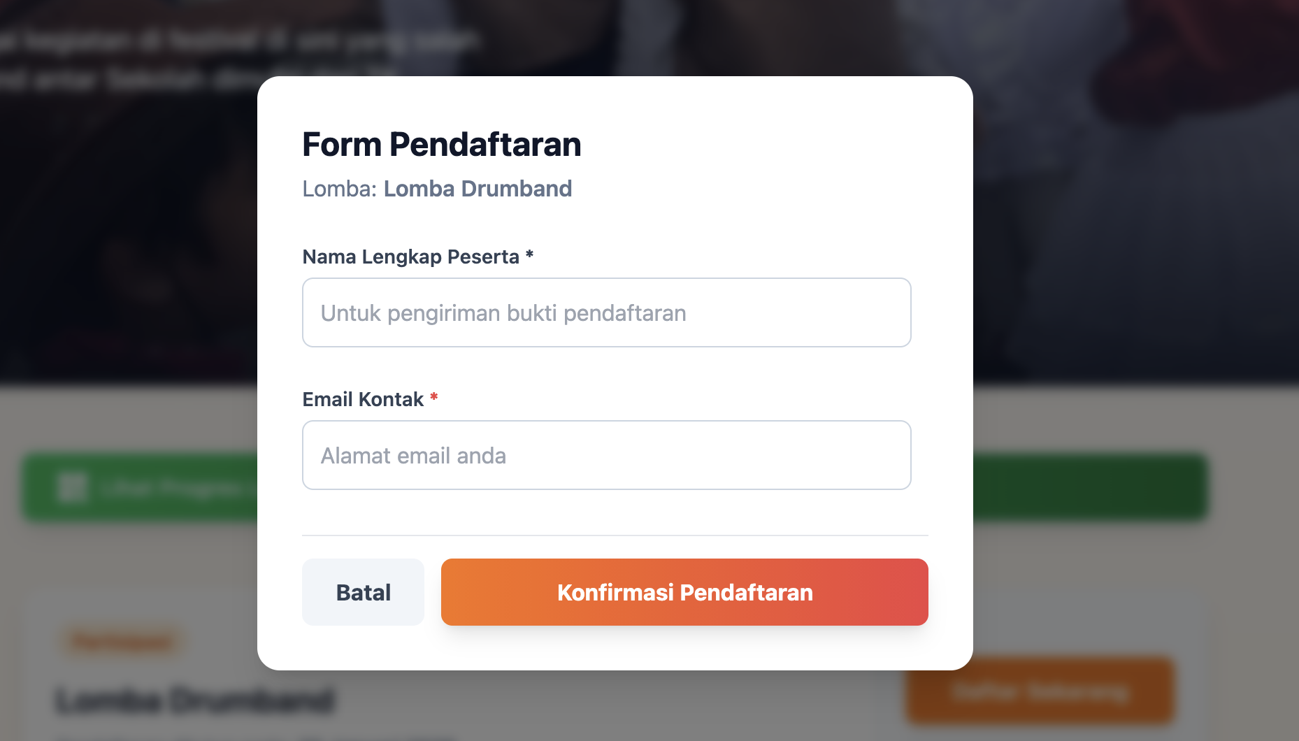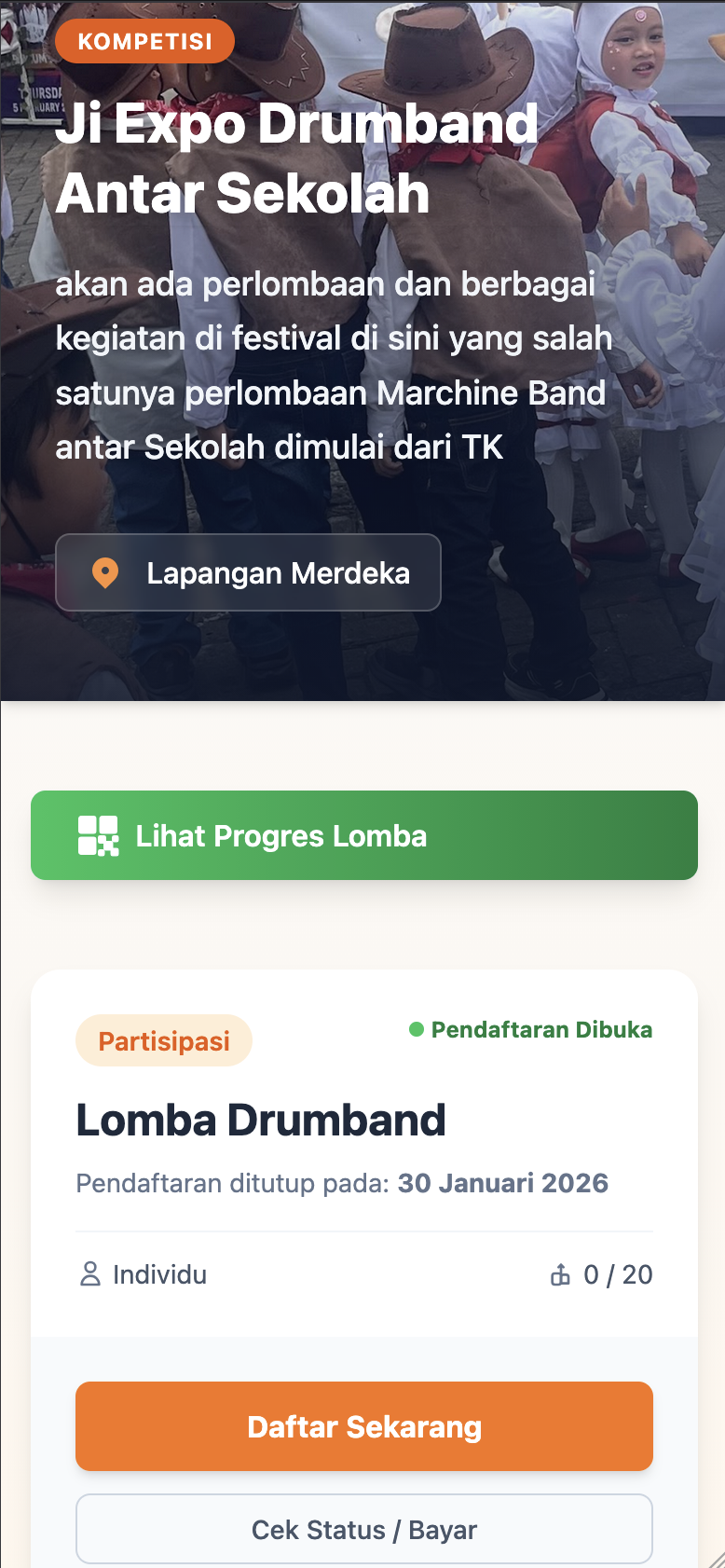 Setelah link di-share, warga tinggal klik. Mereka bakal diarahkan ke halaman khusus acara kita. Di sana sudah ada detail lomba, aturan main, sampai tombol "Daftar". Semua info sudah lengkap, jadi warga nggak perlu tanya-tanya berulang kali di grup WA.